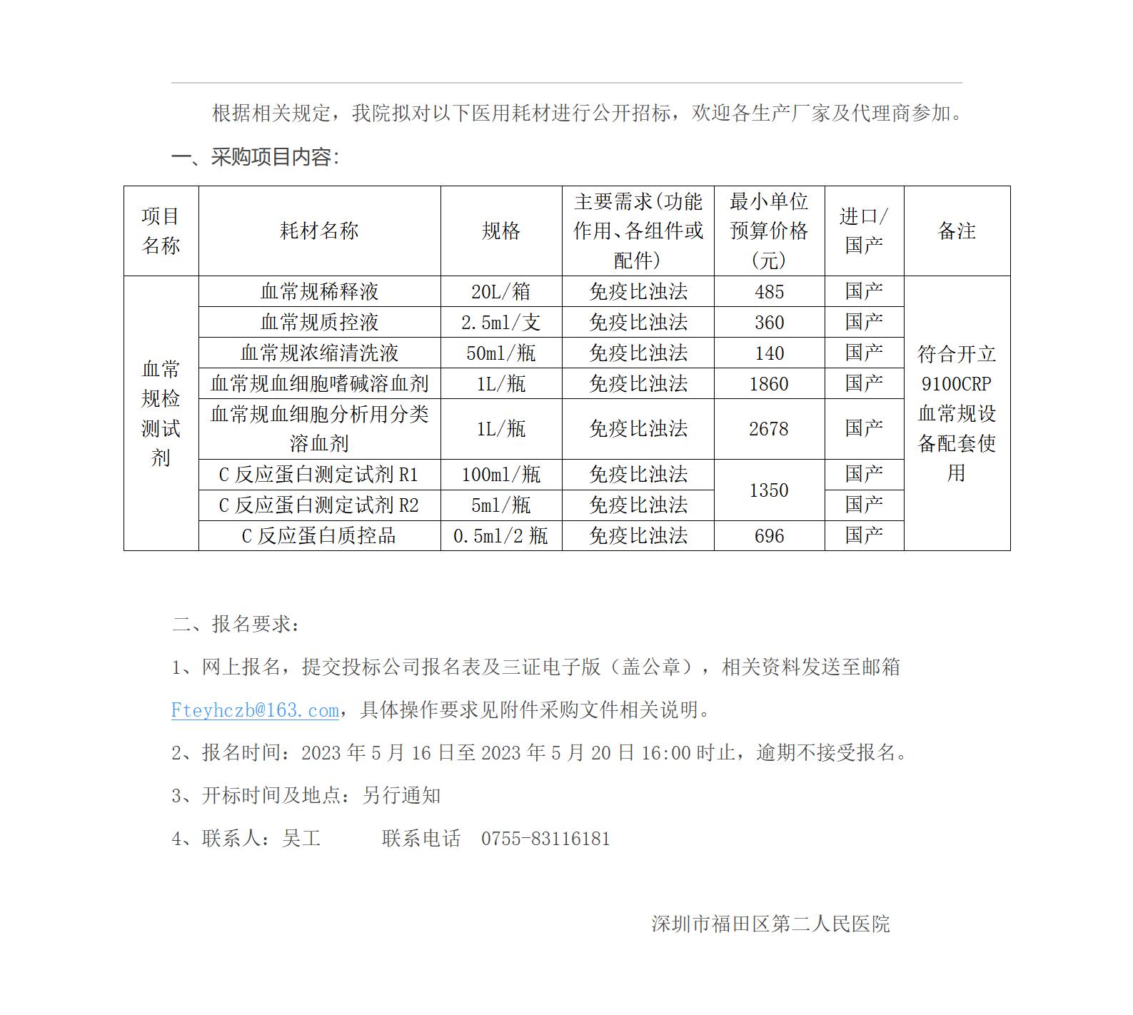 福田区第二人民医院血常规检测试剂医用耗材公开 招标公告