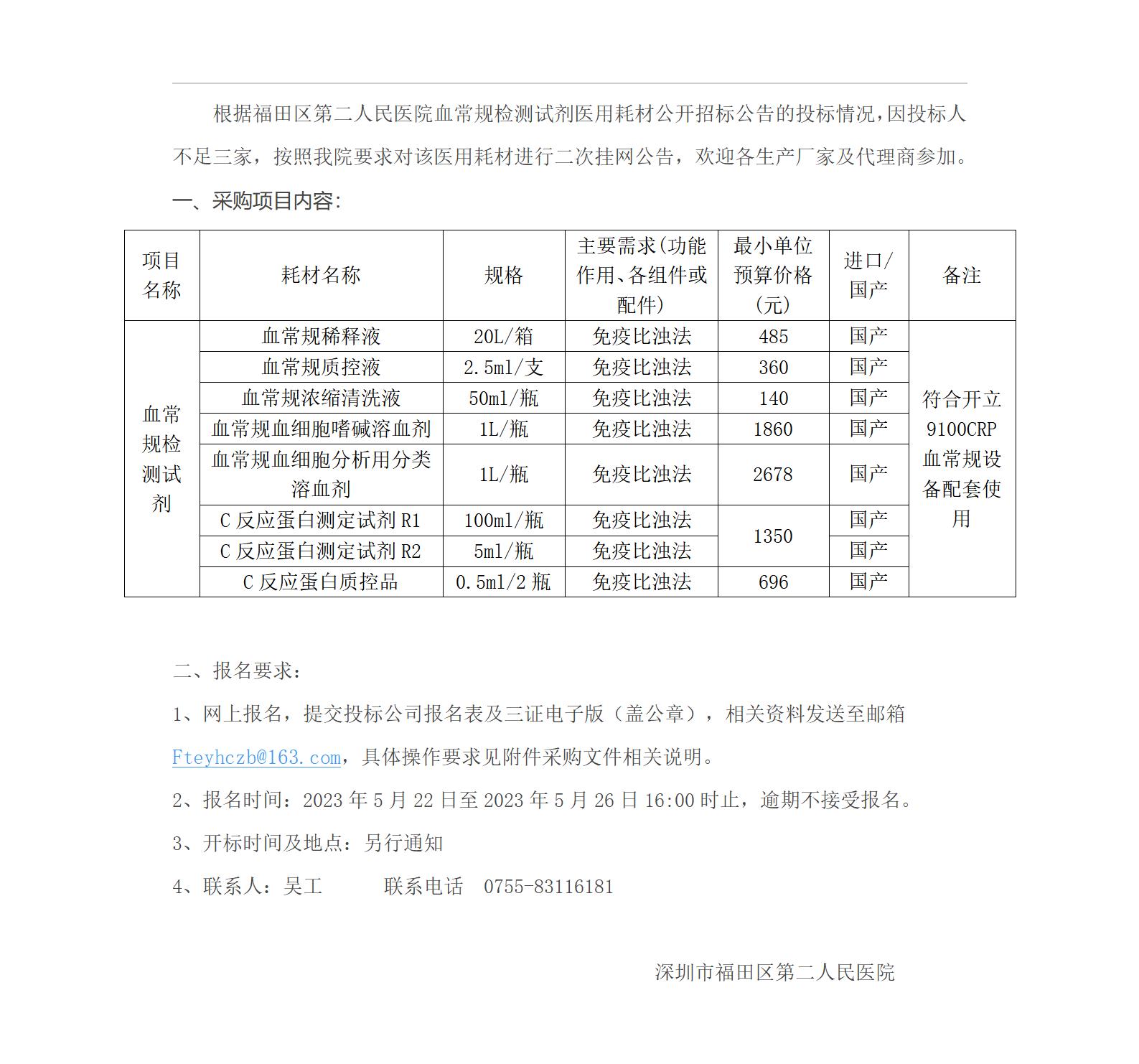 福田区第二人民医院血常规检测试剂医用耗材公开招标 二次公告