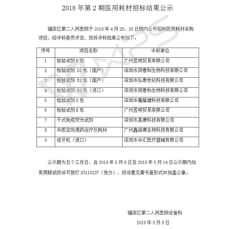 2018年第2期医用耗材招标结果公示