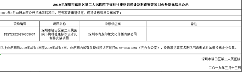 深圳市福田区第二人民医院下梅林社康标识设计及制作安装项目公开招标结果公示