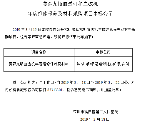 费森尤斯血透机和血滤机 年度维修保养及材料采购项目中标公示