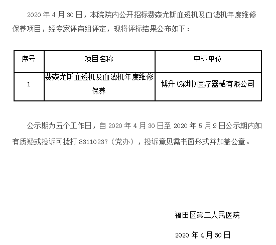 费森尤斯血透机及血滤机年度维修保养中标公示