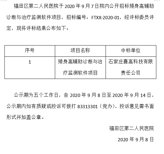 矮身高辅助诊断与治疗监测软件项目招标结果公示