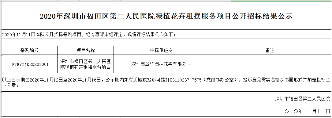 2020年深圳市福田区第二人民医院绿植花卉租摆服务项目公开招标结果公示