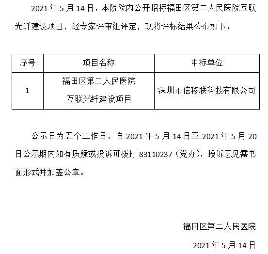 福田区第二人民医院互联光纤建设项目中标公告