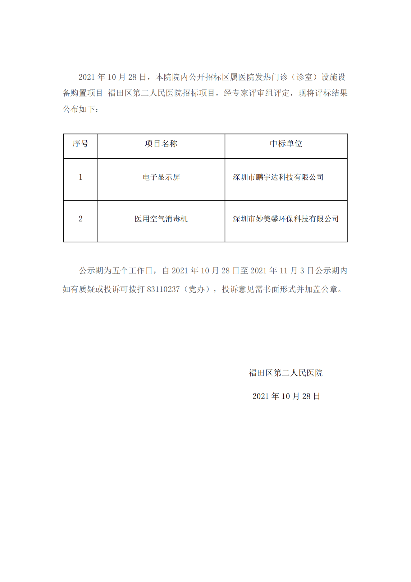 区属医院发热门诊(诊室)设施设备购置项目-福田区第二人民医院中标公示