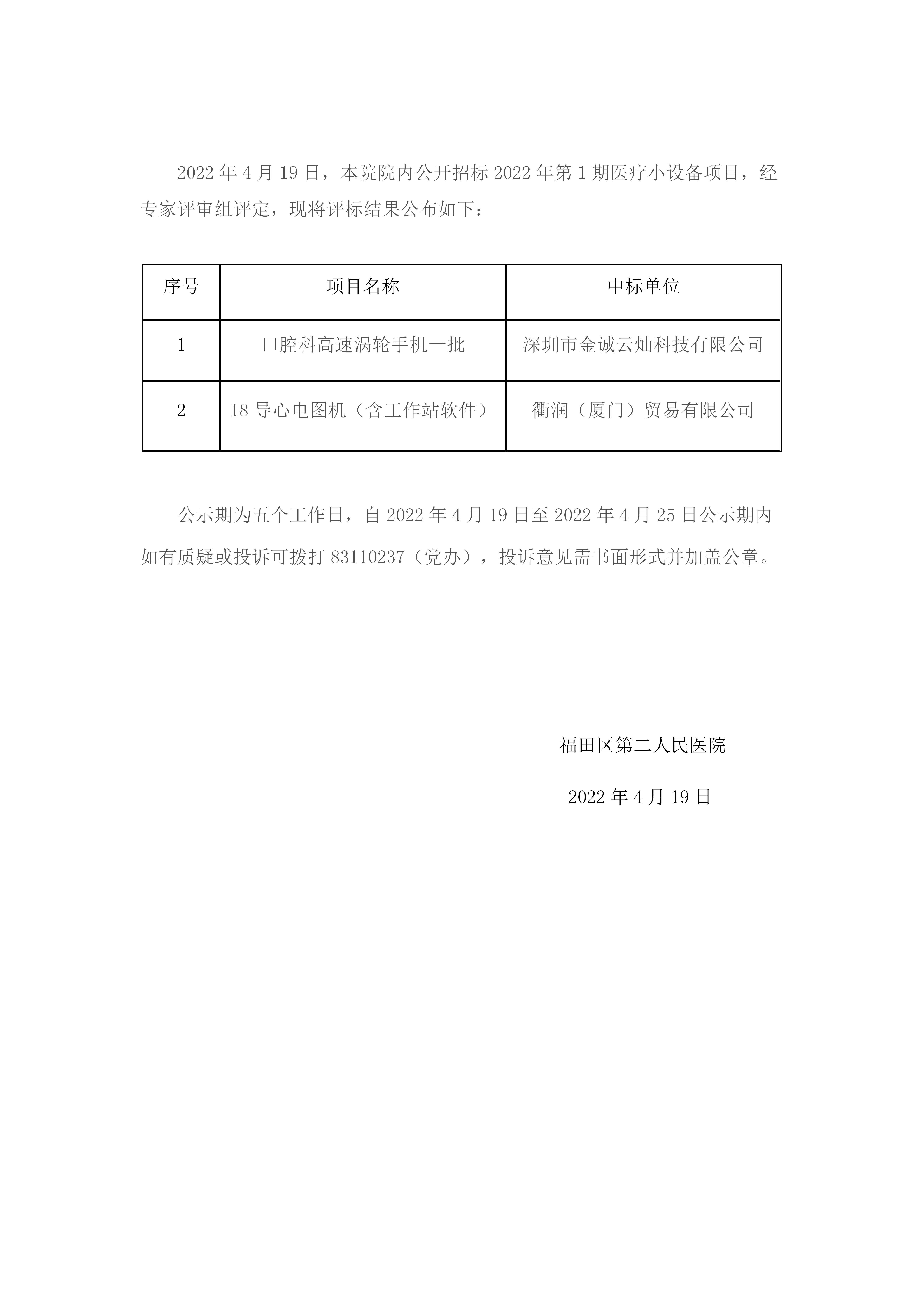 福田区第二人民医院2022年第1期医疗小设备采购中标公示