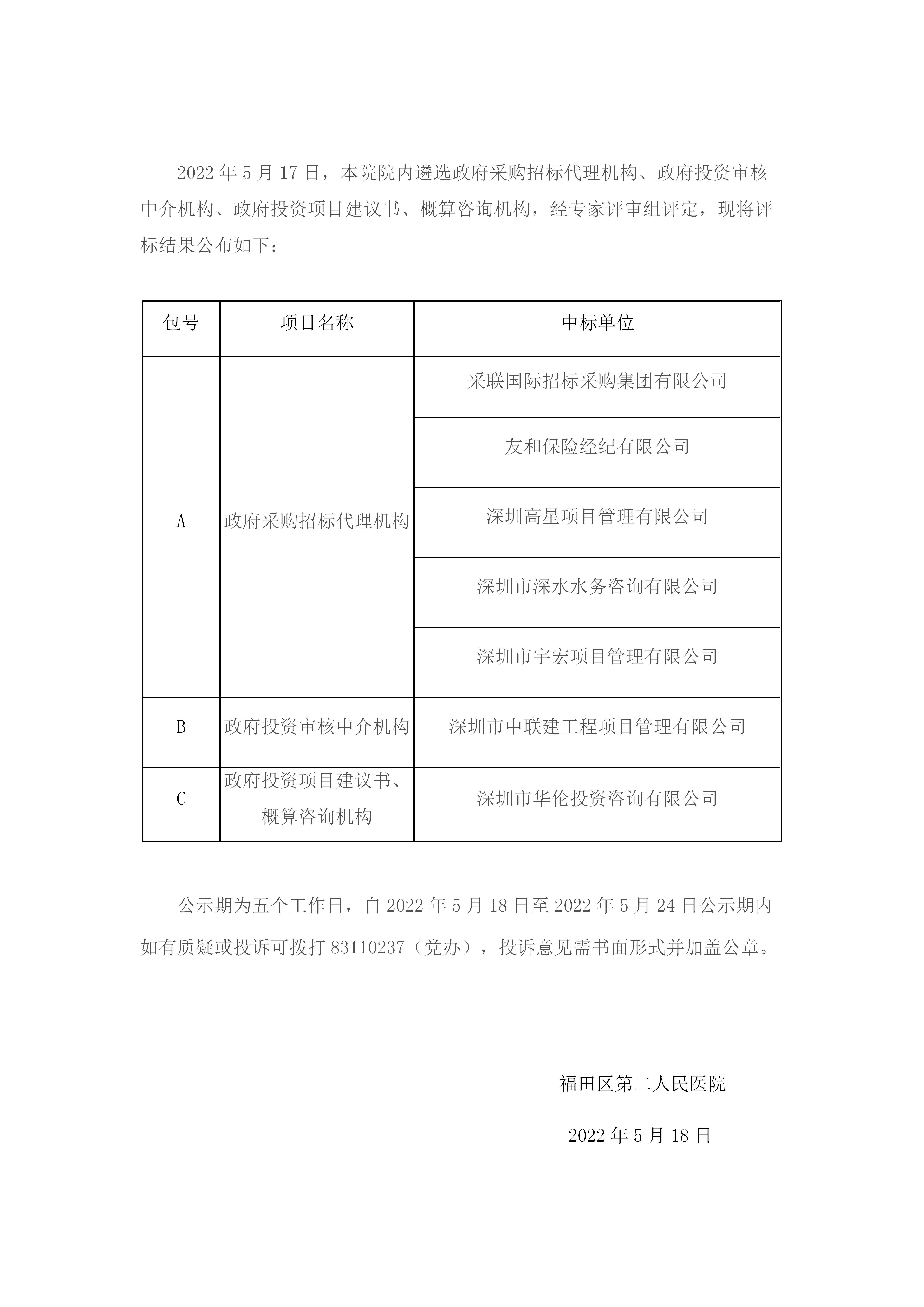 福田区第二人民医院遴选政府采购招标代理机构、政府投资审核中介机构、政府投资项目建议书、概算咨询机构中标公示