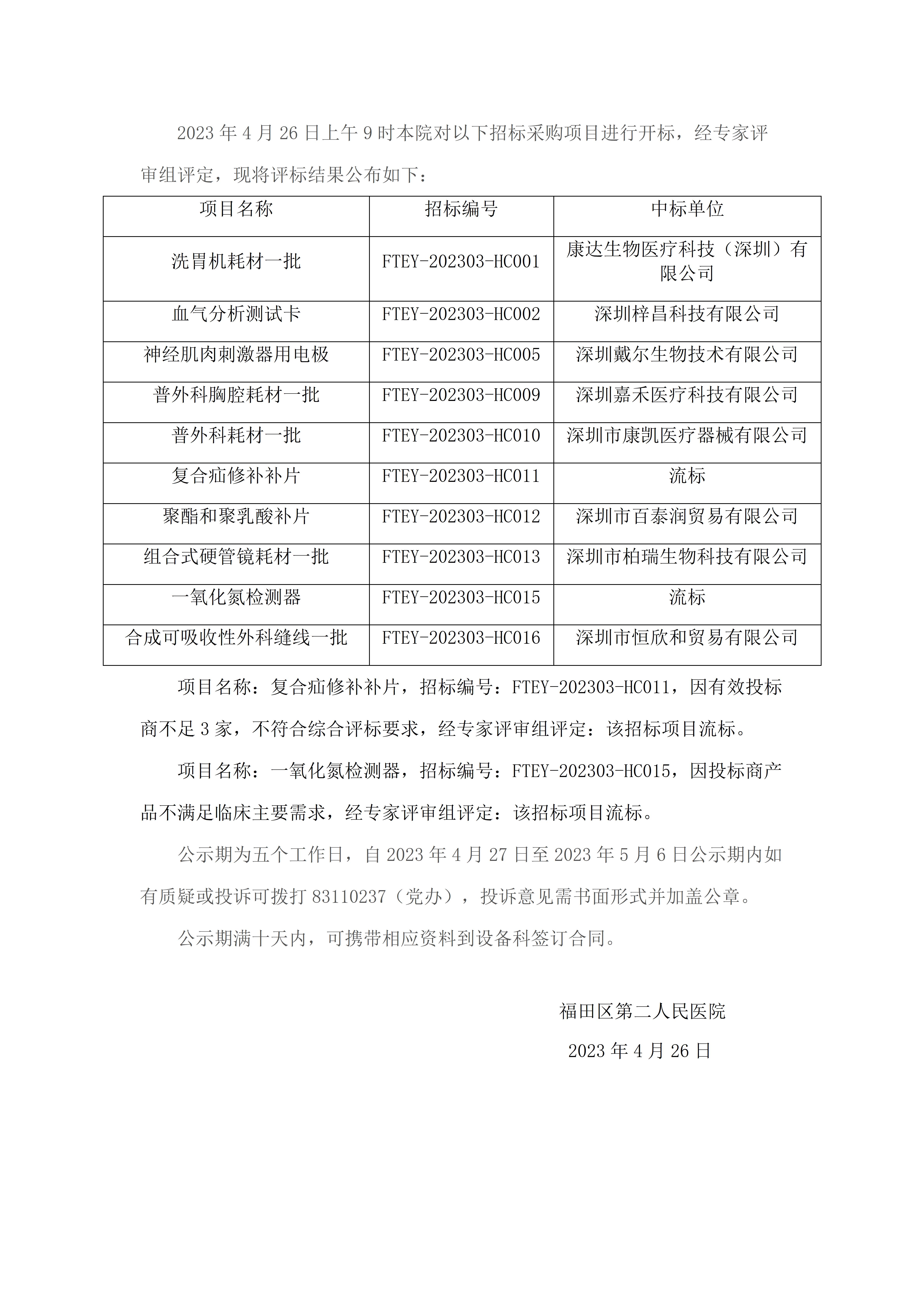 福田区第二人民医院2023年第3期医用耗材 中标公示