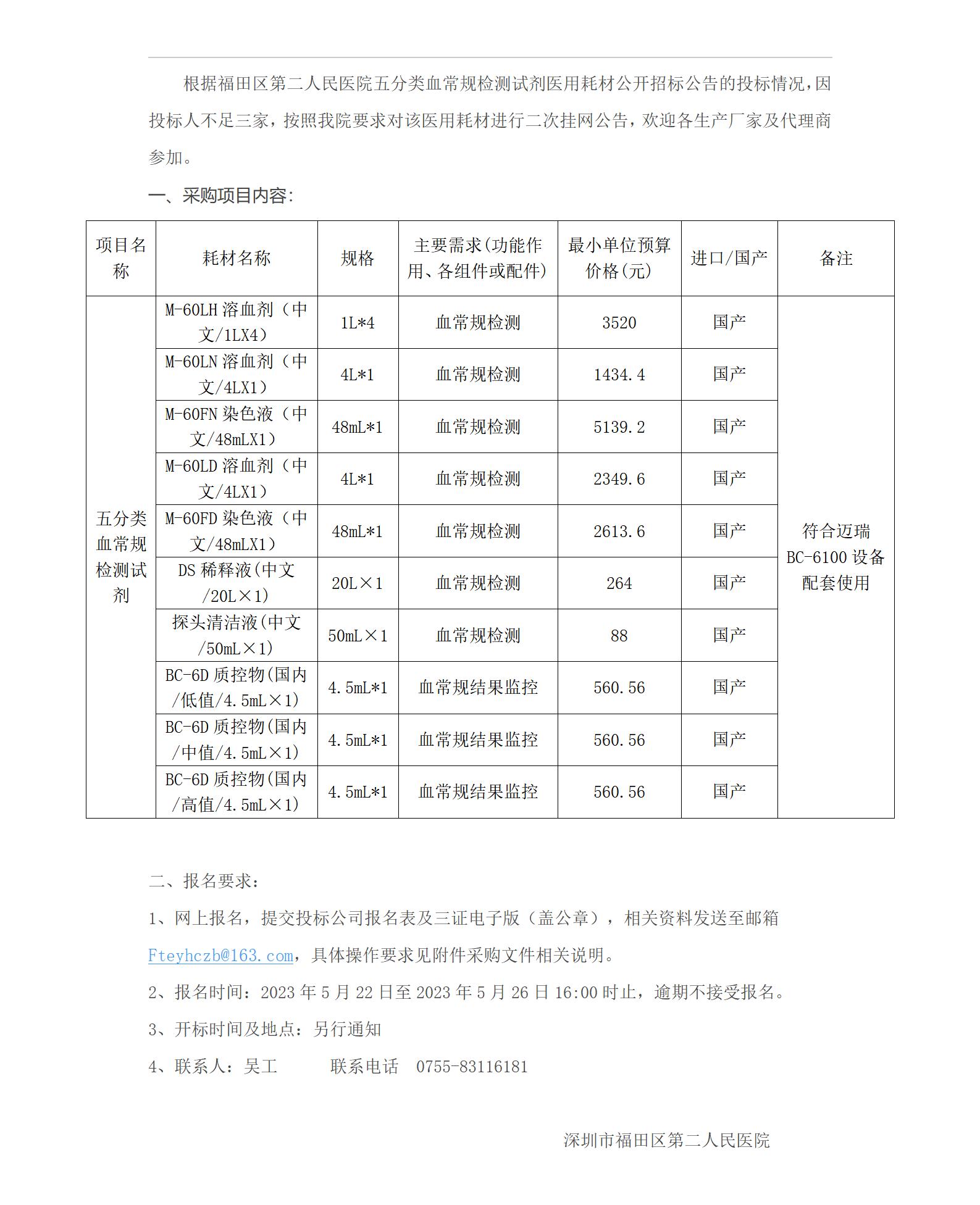 福田区第二人民医院五分类血常规检测试剂医用耗材公开招标二次公告