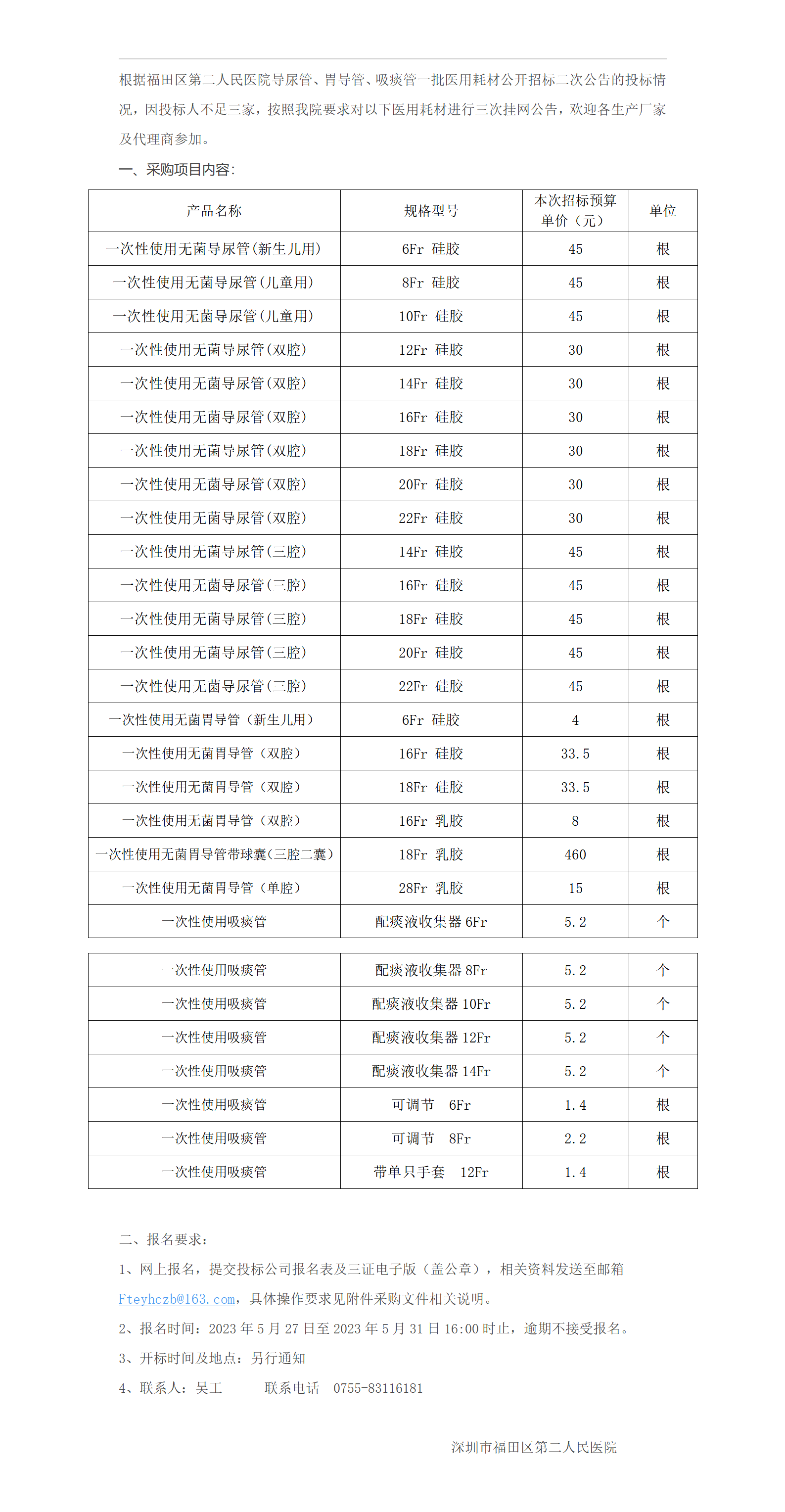 福田区第二人民医院导尿管、胃导管、吸痰管一批医用耗材公开招标三次公告