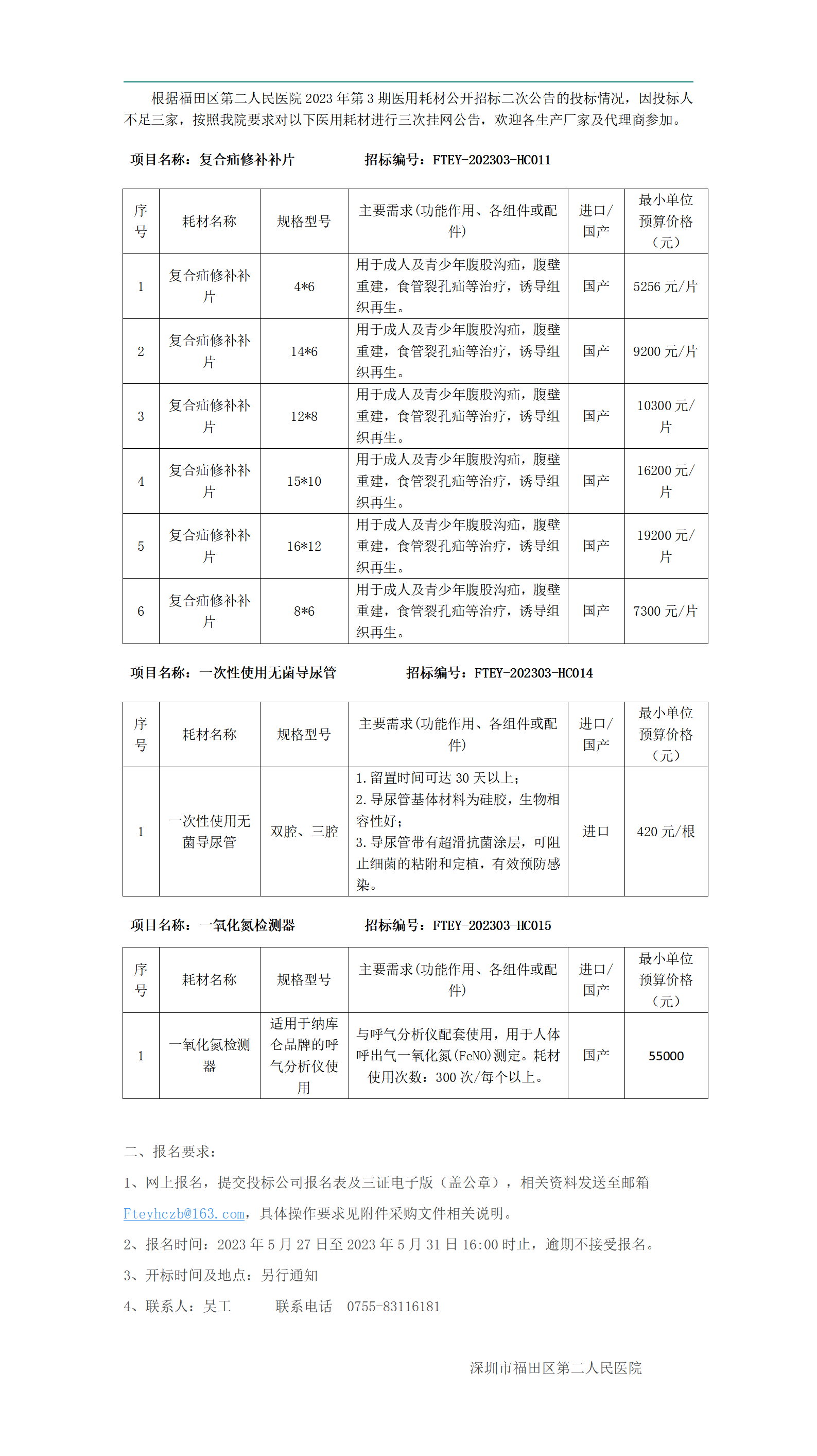 福田区第二人民医院2023年第3期医用耗材公开招标 三次公告