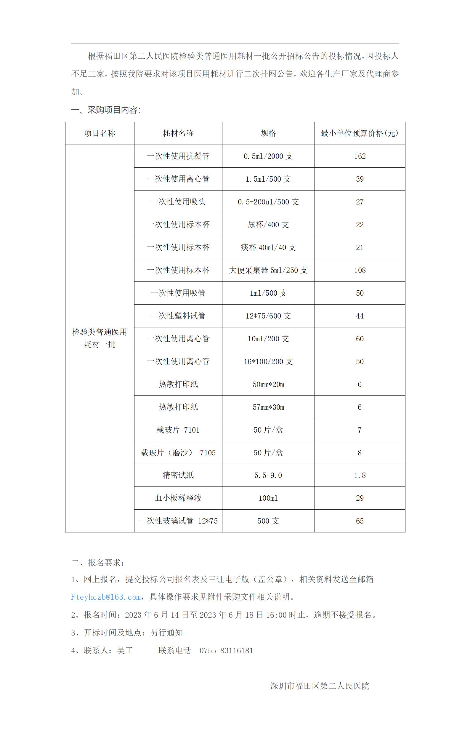 福田区第二人民医院检验类普通医用耗材一批 公开招标二次公告