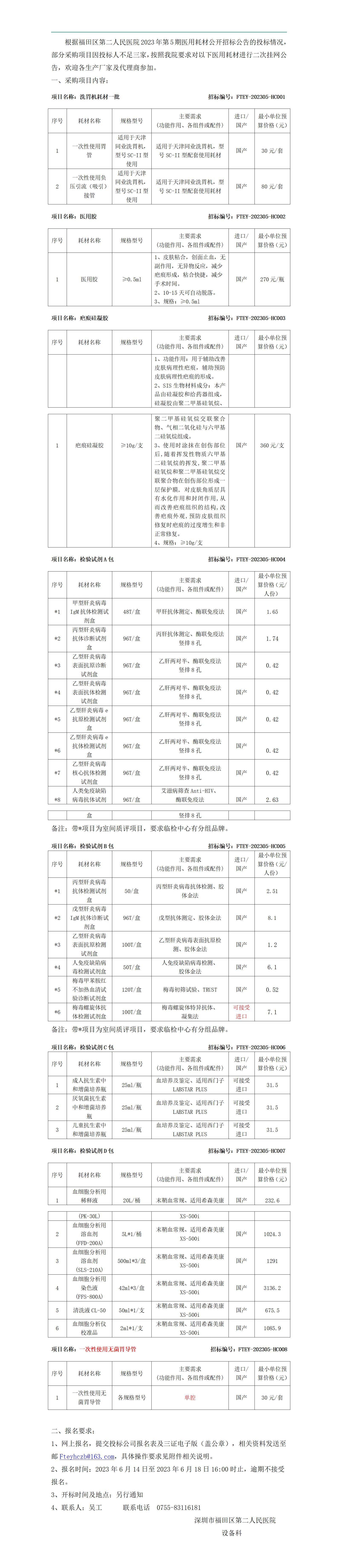 福田区第二人民医院2023年第5期医用耗材公开招标 二次公告