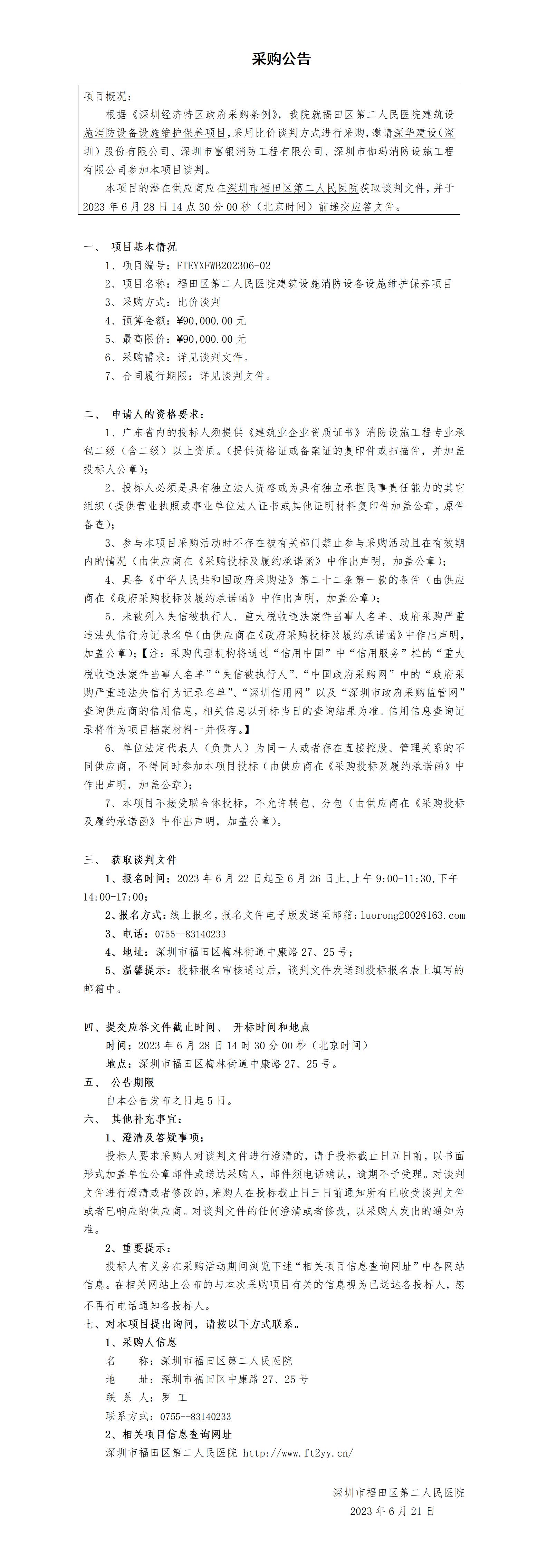 福田区第二人民医院建筑设施消防设备设施维护保养项目采购公告.