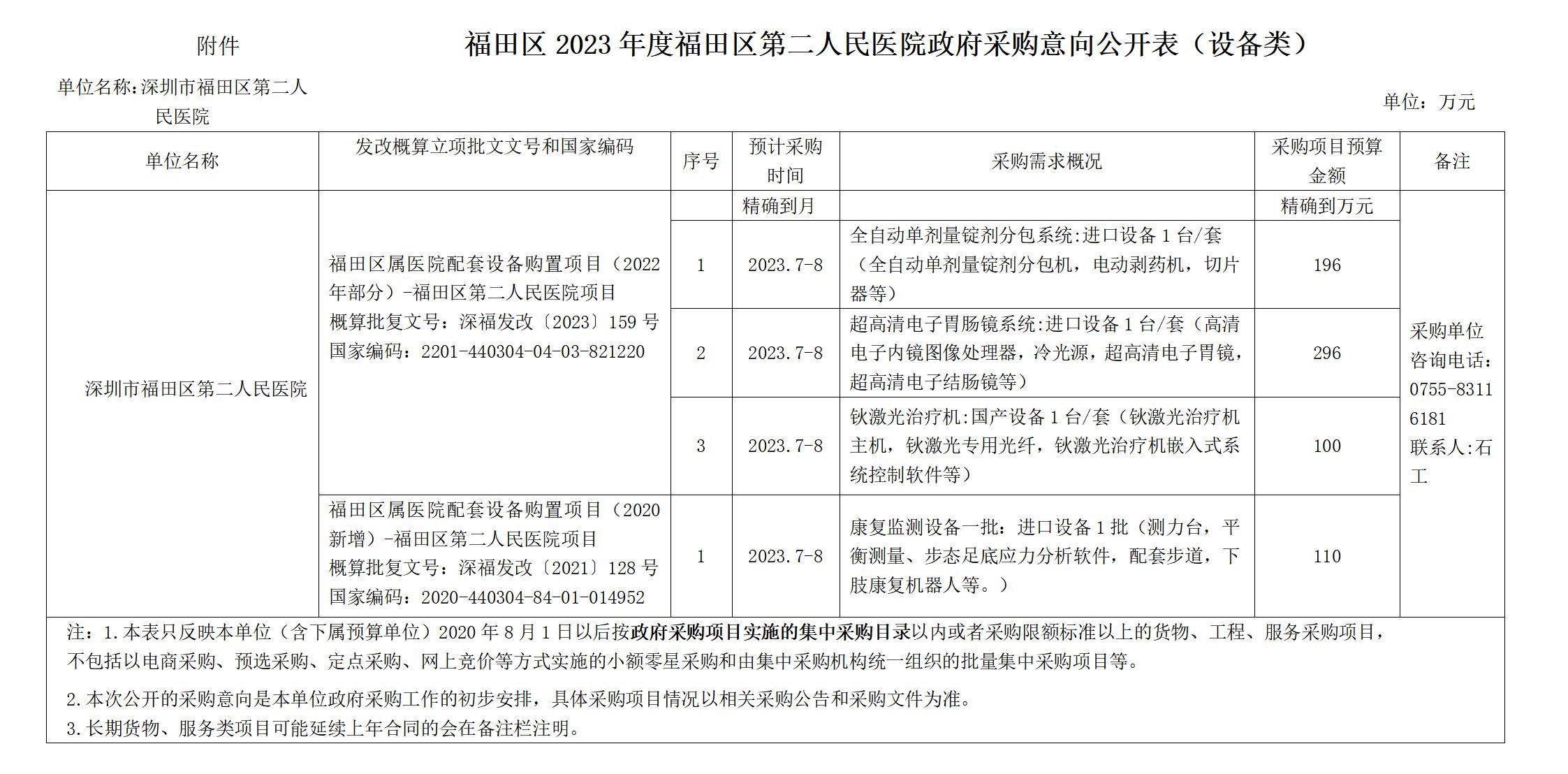 福田区2023年度福田区第二人民医院政府采购意向公开表(设备类)