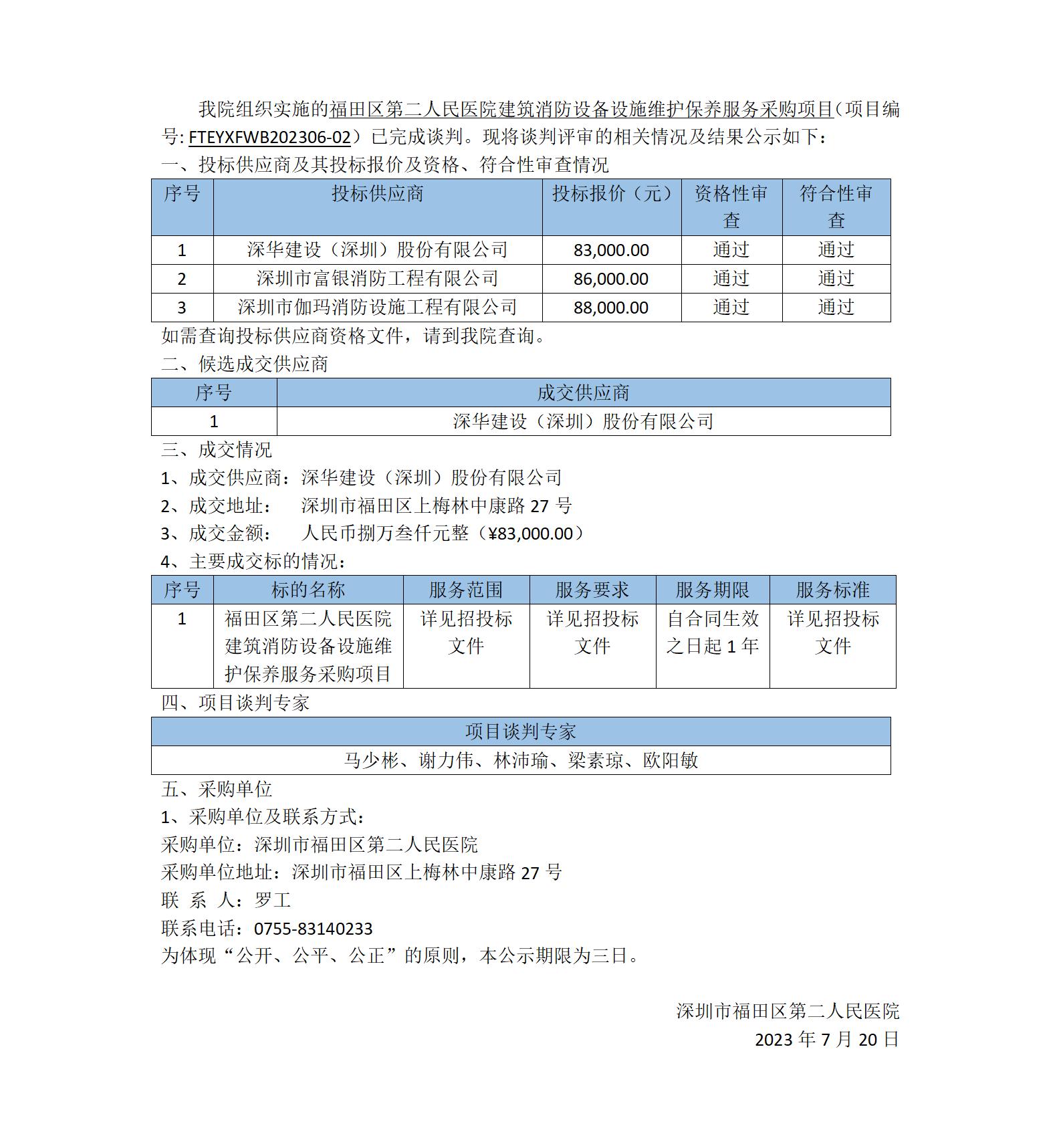 福田区第二人民医院建筑消防设备设施 维护保养服务采购项目成交公告
