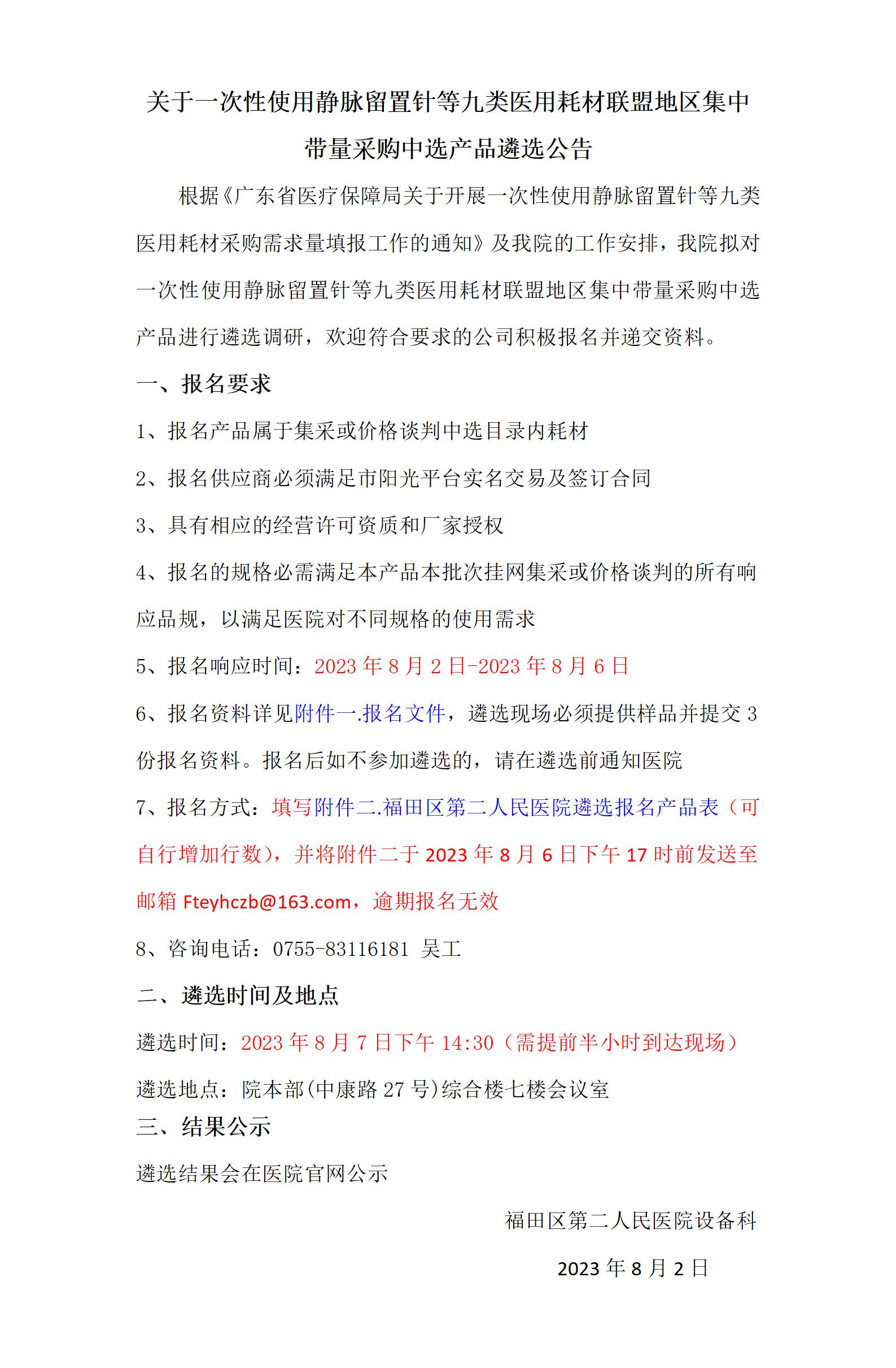 关于一次性使用静脉留置针等九类医用耗材联盟地区集中带量采购中选产品遴选公告