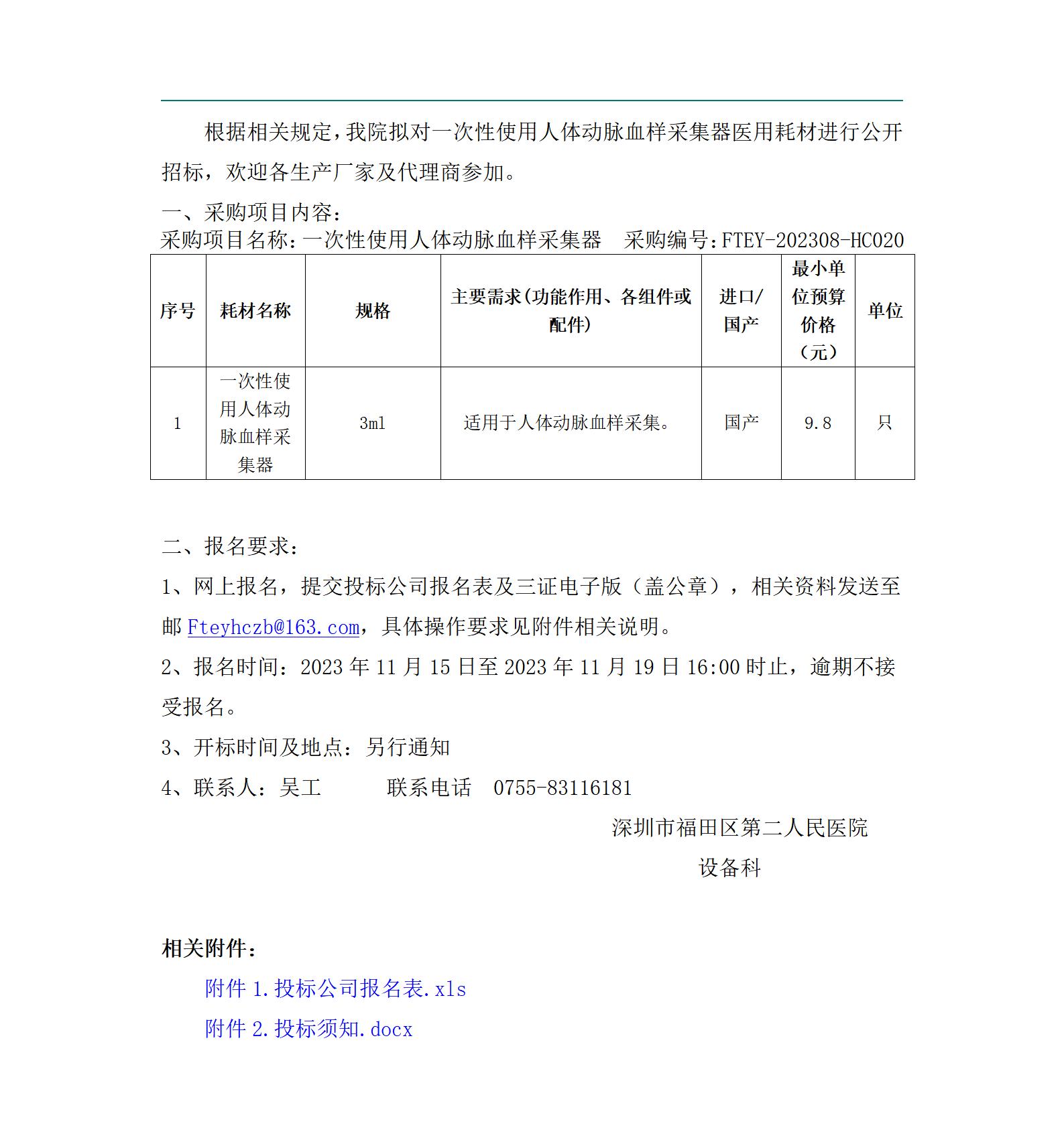福田区第二人民医院一次性使用人体动脉血样采集器公开招标公告