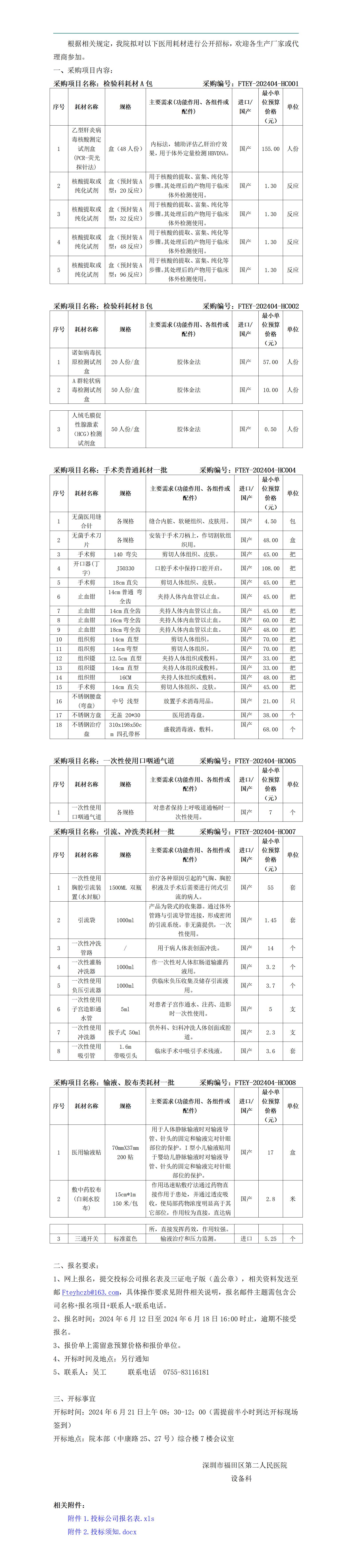 福田区第二人民医院2024年第4期医用耗材公开招标 三次公告