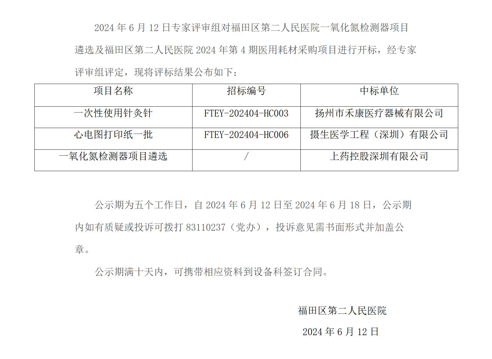 福田区第二人民医院医用耗材中标公示