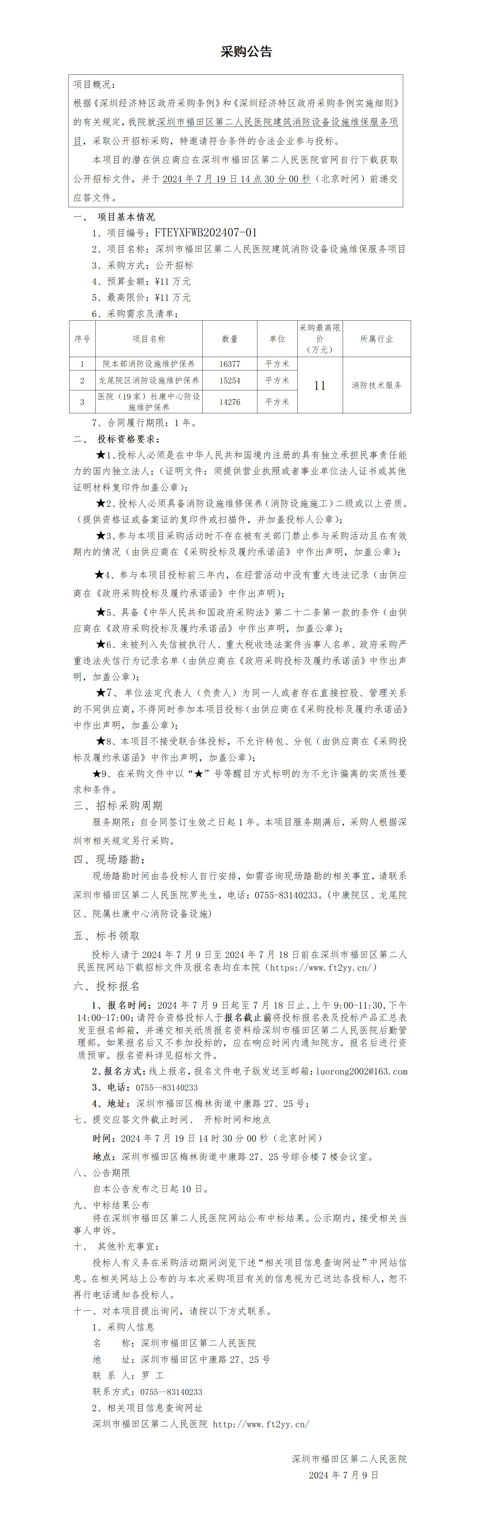 深圳市福田区第二人民医院建筑消防设备设施维保服务项目采购公告