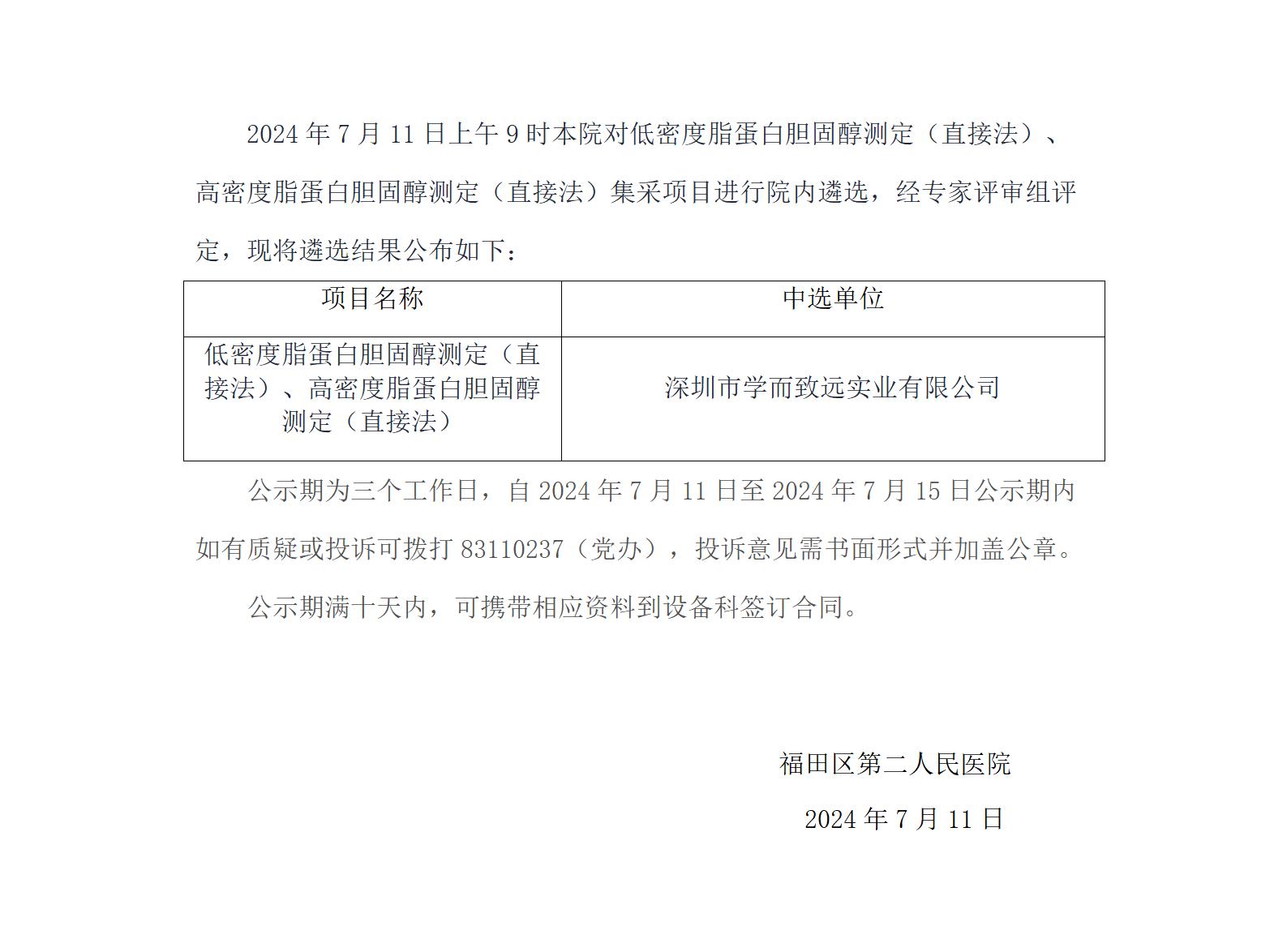关于低密度脂蛋白胆固醇测定(直接法)、高密度脂蛋白胆固醇测定(直接法)集采项目院内遴选结果公告