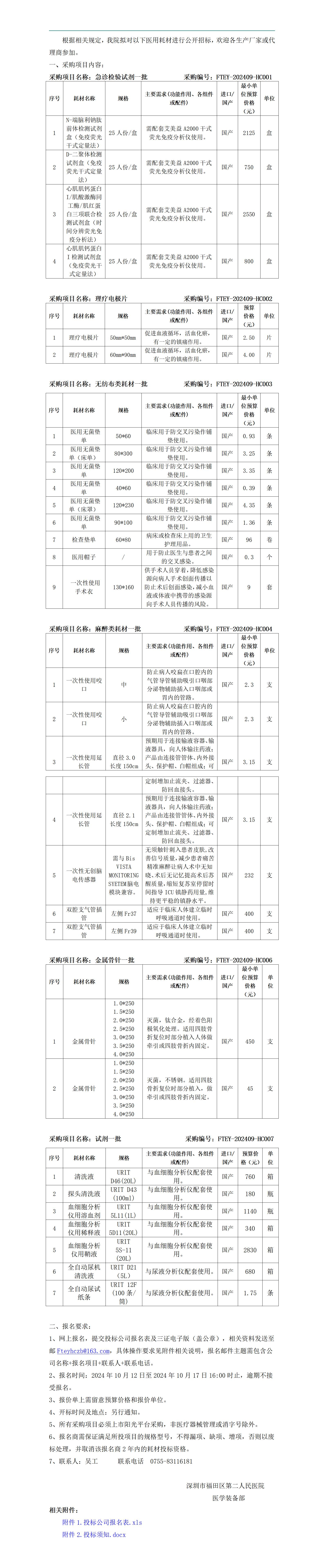 福田区第二人民医院2024年第9期医用耗材公开招标 二次公告