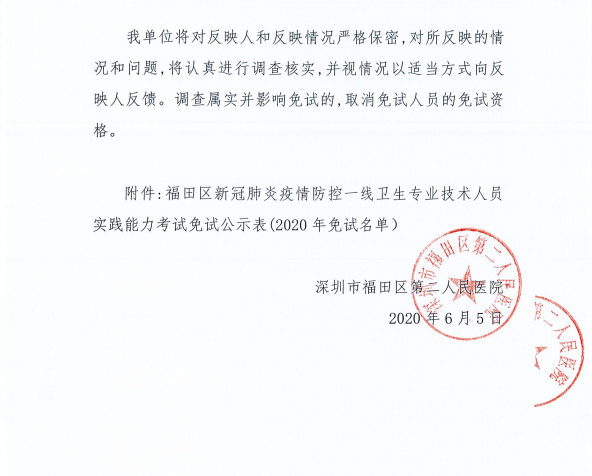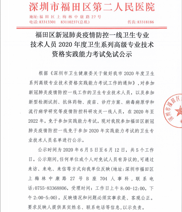 福田区新冠肺炎疫情防控一线卫生专业技术人员2020年度卫生系列高级专业技术资格实践能力考试免试公示